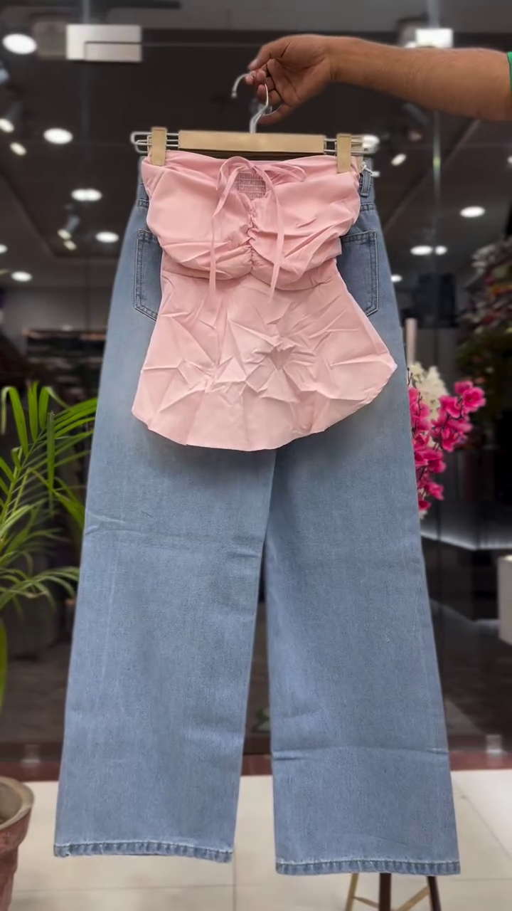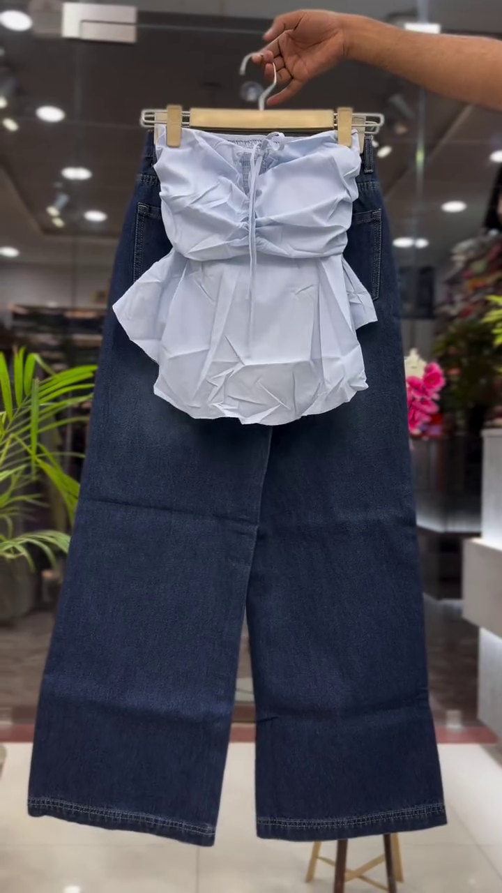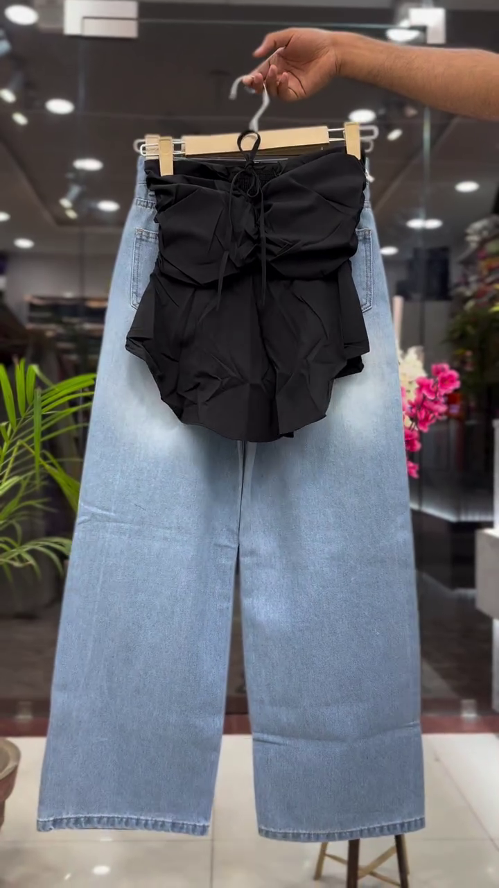 This fashionable two-piece women’s outfit features a dramatic black bow strapless top paired with high-waist wide-leg light blue denim pants, creating a bold and stylish modern fashion look.