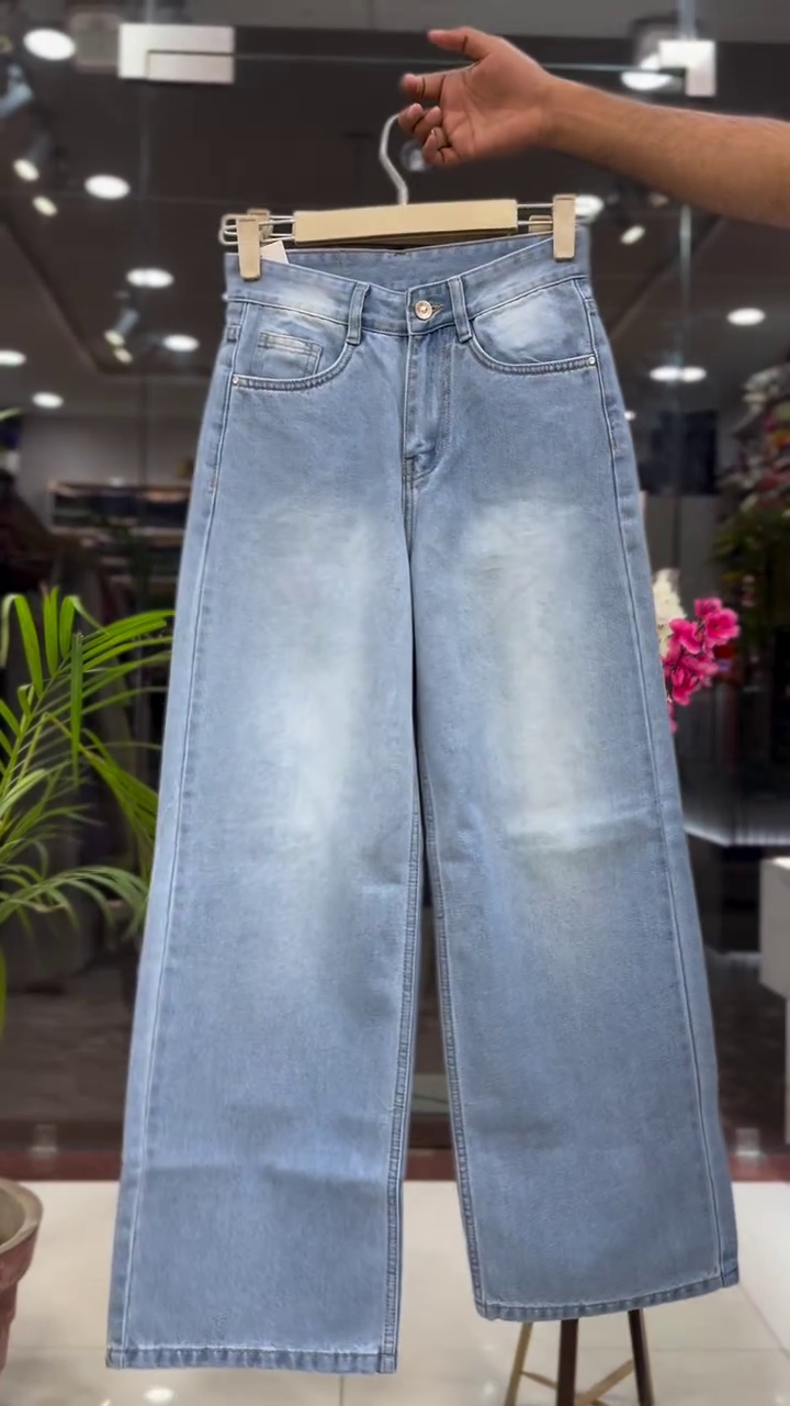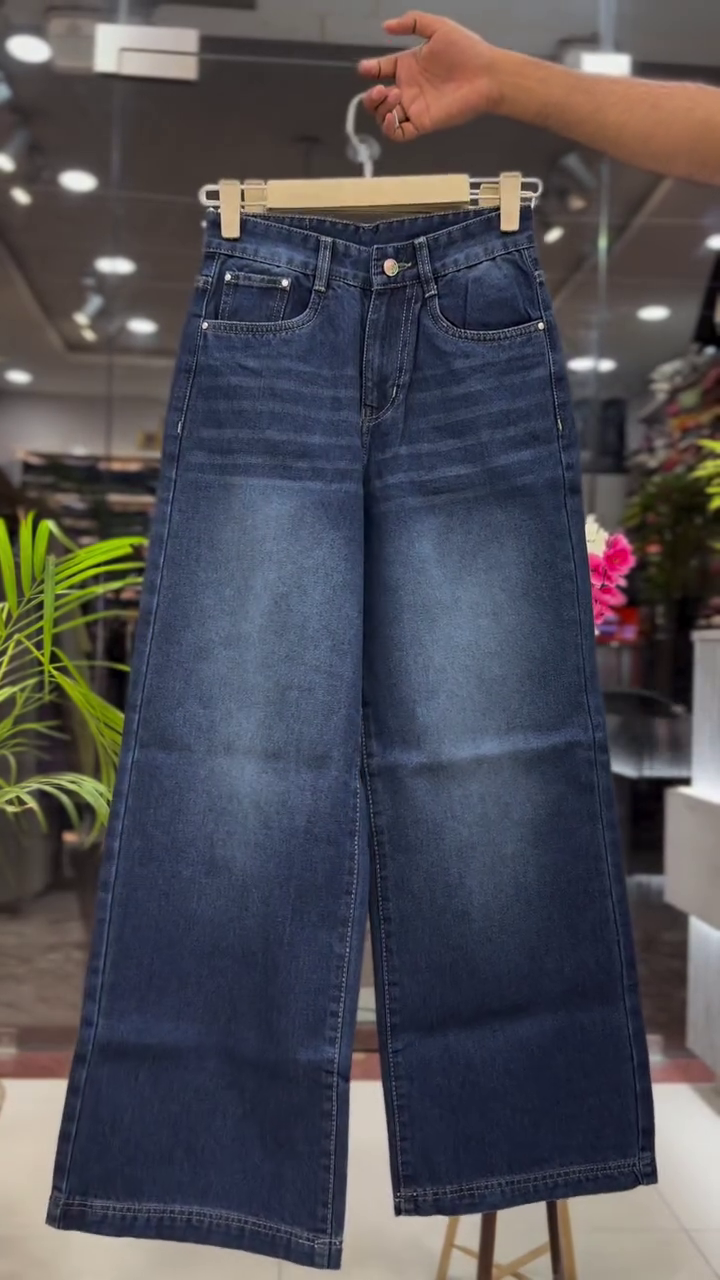 The pants are high-waisted wide-leg denim trousers designed for comfort and modern fashion styling. The loose wide-leg cut provides a flattering silhouette and allows easy movement while maintaining elegance.