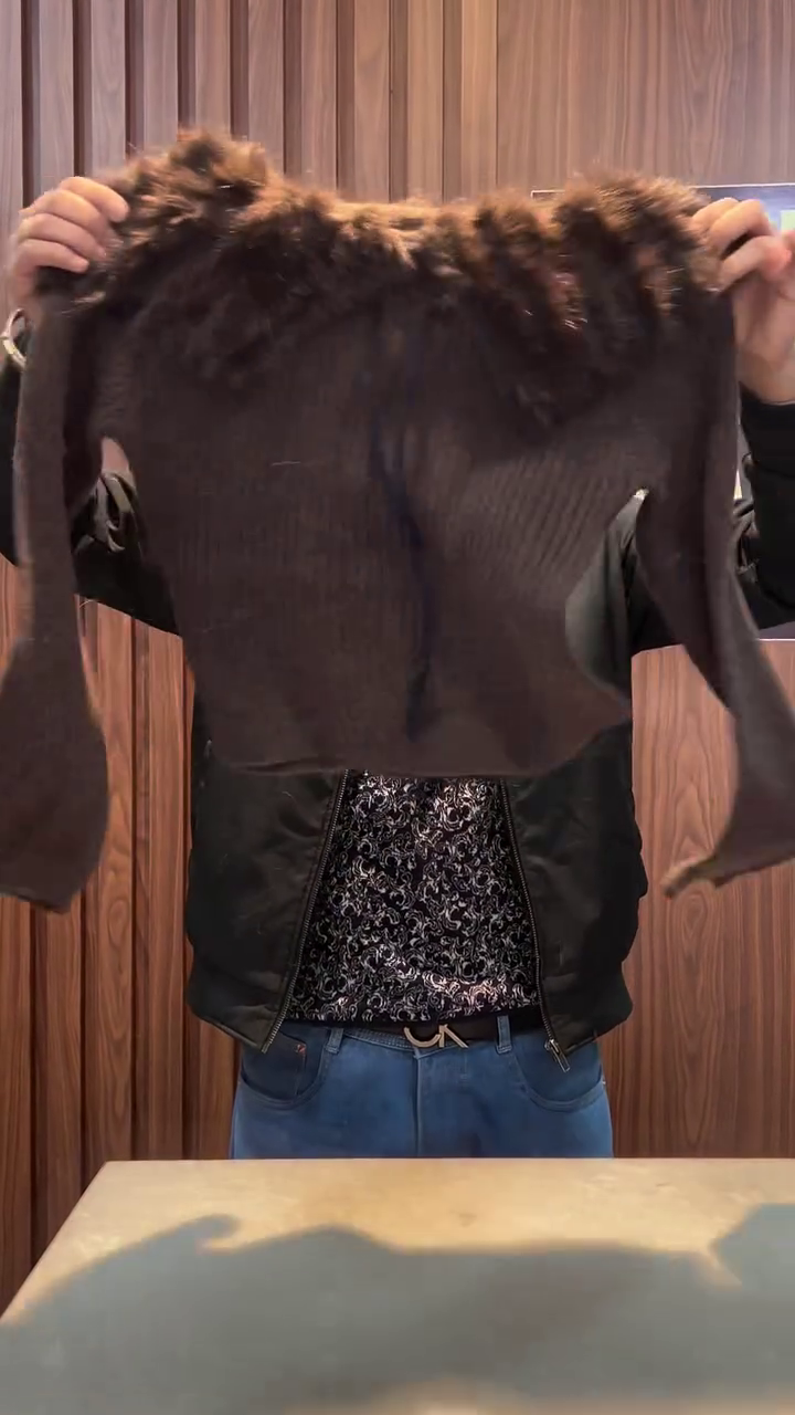 The Cocoa Whirl sweater is a cozy embrace in cropped form 🤗. With ribbed texture that dances in light 🧵✨ and a plush furry collar that whispers warmth 🐻❄️, this piece is perfect for layering over denim, skirts, or even sarees for a fusion twist 👖👗. Held up proudly in a rustic setting of wood paneling 🌲 and casual charm, it invites you to feel the season in every thread. Available in ALL sizes—because comfort and style should wrap around every body like a hug 🤎🌈.