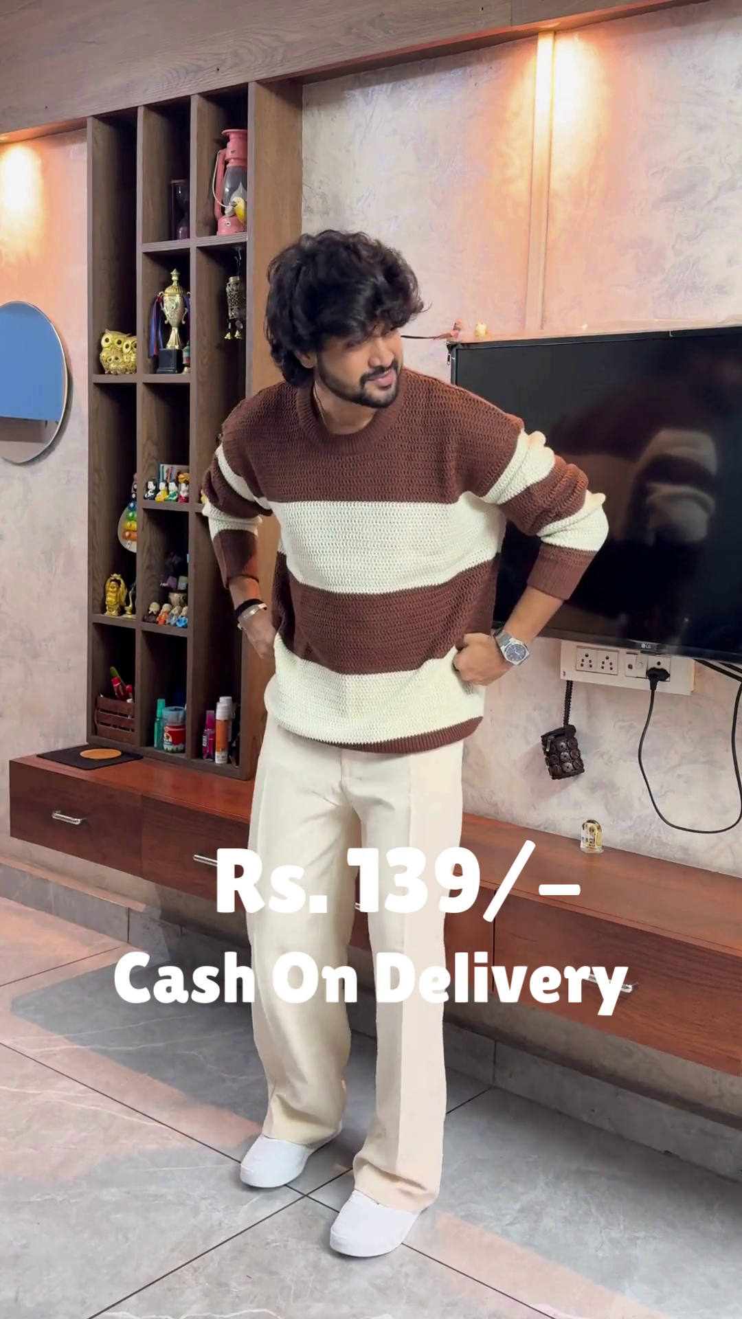 The Crimson Ease outfit is a warm embrace in motion 🔥🤗. A red sweater layered over a white shirt creates a classic contrast 🎨, while cream-colored pants soften the palette with gentle elegance 🤍👖. White shoes ground the look in simplicity 👟🌿, and the subtle sleeve adjustment adds a touch of lived-in charm 💫. Set in a modern room of mirrors, shelves, and warm lighting 🪞🛋️, this look is perfect for festive mornings or reflective evenings. Available in ALL sizes—because comfort and color belong to every soul 🌍❤️.
