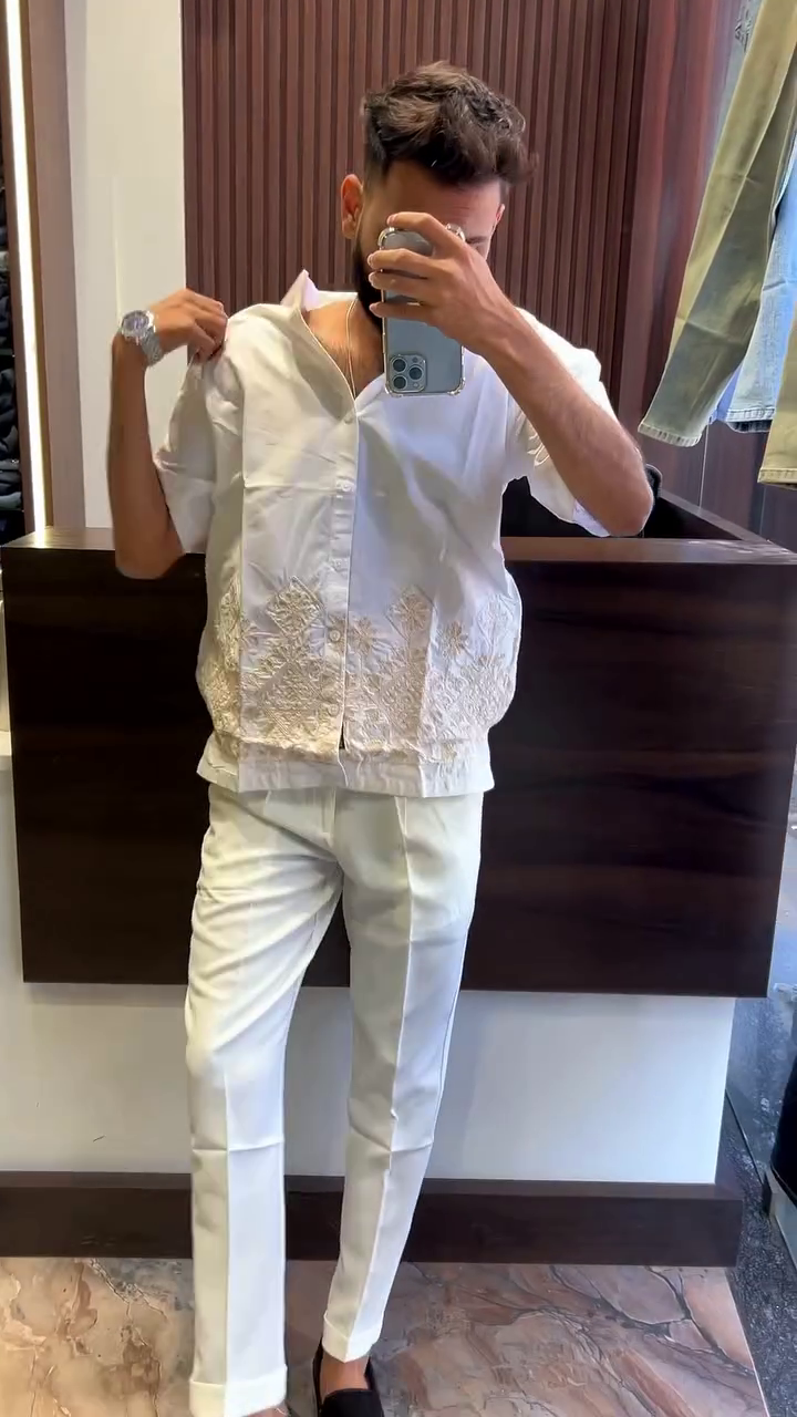 This earthy cocoa brown half-sleeve shirt 🀎 features a relaxed tailored silhouette with a clean front button-down closure πŸ”˜ and a soft structured collar πŸ‘”. The highlight of this piece is the beautifully detailed cream ethnic embroidery running along the bottom hem 🧡✨, showcasing geometric diamond motifs, floral vines 🌸, and traditional-inspired patterns that create a bold statement finish.