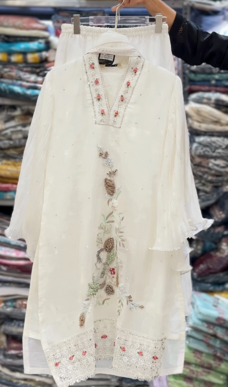 Step into timeless elegance with this beautifully designed white embroidered kurti palazzo set. The kurti features a soft and graceful silhouette with delicate floral embroidery on the front, enhanced with subtle bead and thread work that adds a premium touch. The neckline is adorned with fine detailing and small floral embellishments, giving it a sophisticated and festive look.