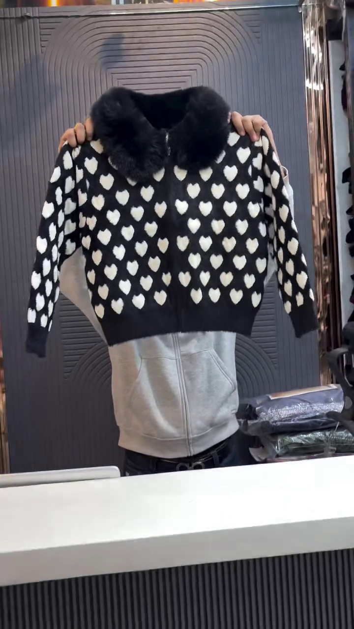 This adorable fluffy pink cardigan 🩷 is covered in soft white heart motifs 🤍, making it perfect for cozy, cute winter looks. The standout feature is the oversized faux fur collar that feels plush and warm around the neck, giving a luxe touch to the overall design. The cardigan has a front zipper for easy wear and temperature control, plus long sleeves and a relaxed fit that layers comfortably over tops or dresses. The hem sits at a flattering length around the waist, ideal for pairing with high‑waist jeans, skirts, or joggers. The fuzzy texture keeps you toasty on cold days while still looking stylish and playful. Great for coffee dates, outings with friends, or casual winter events. Style it with pastel accessories, boots, and a small handbag for a complete soft‑girl aesthetic. ✨