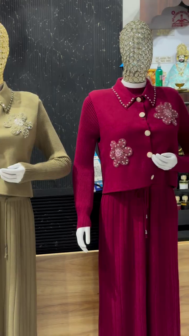 This elegant golden beige knit co‑ord set 💛 brings a sophisticated touch to winter wardrobes. The top is a structured knit jacket‑style sweater with long sleeves and a classic collar. Pearl‑like bead detailing decorates the collar and front placket, while delicate floral embellishments on the chest elevate the look with subtle sparkle ✨. The matching long skirt features vertical ribbed pleats and a drawstring waist for comfort and adjustability. Together, they create a graceful, elongated silhouette perfect for parties, family gatherings, or semi‑formal outings. The soft knit fabric provides warmth without feeling too heavy, making it ideal for cooler months. Pair this set with heeled boots or pumps, a clutch, and minimal jewelry to let the embellishments stand out.