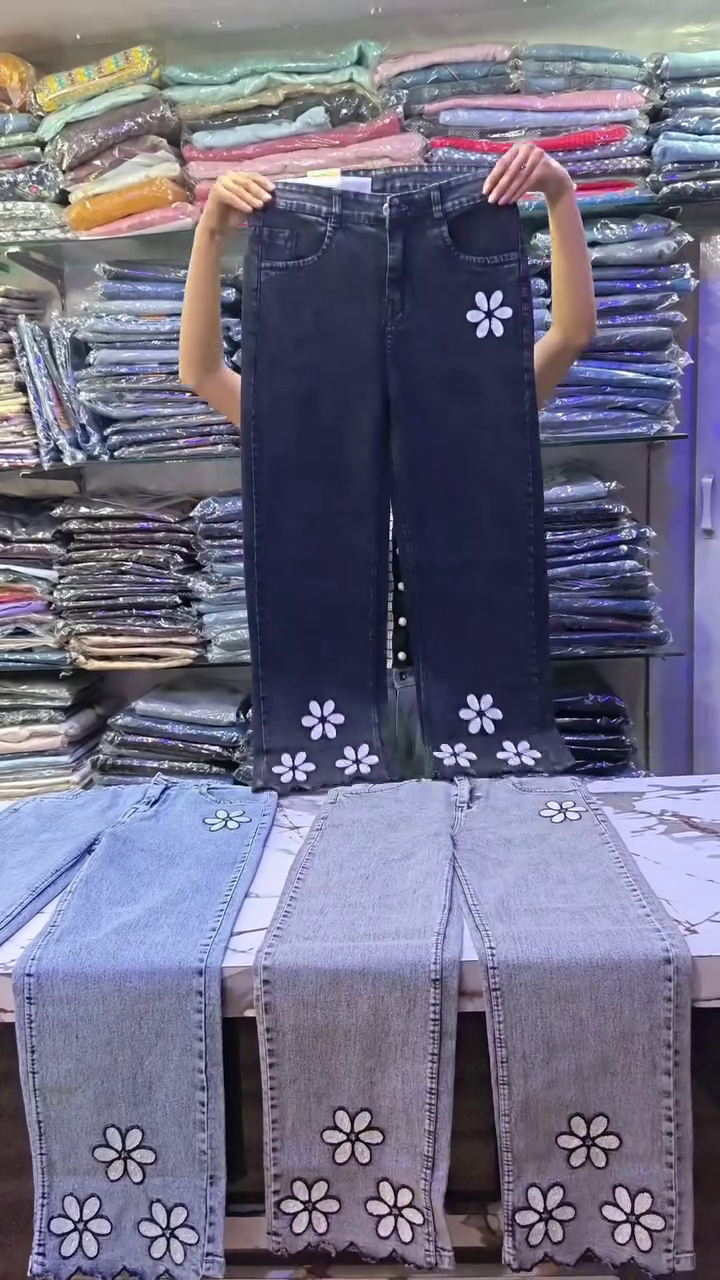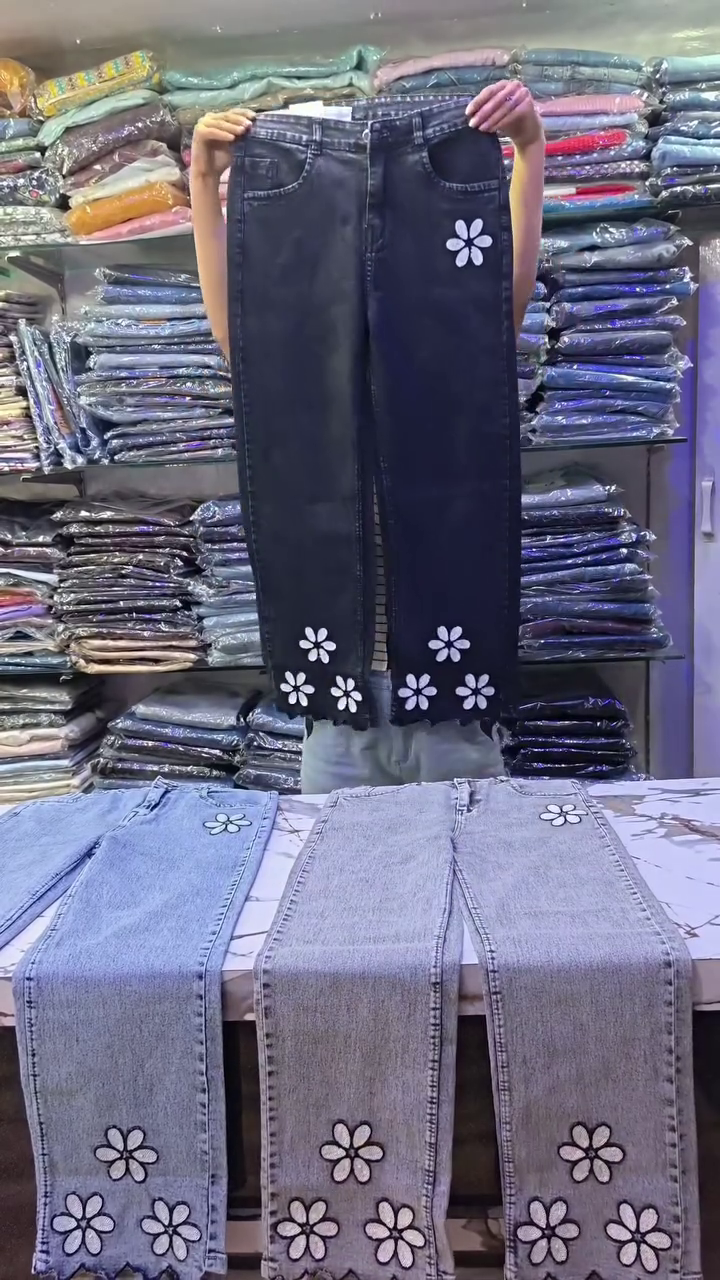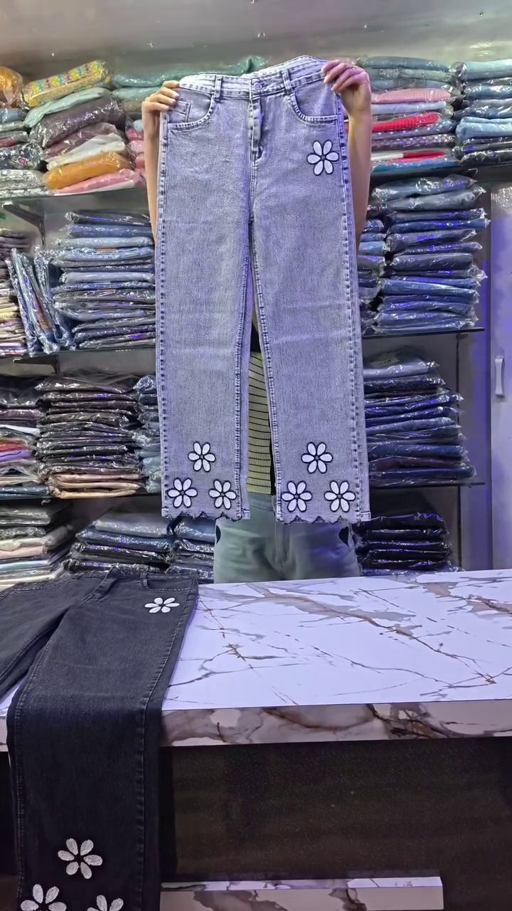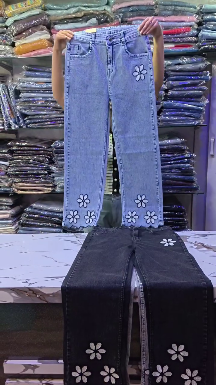 These trendy straight-fit jeans π are designed with high-waist structure π offering flattering shape and comfort. The light blue and deep black variants π€ feature cute daisy floral embroidery πΌ placed along the leg panels and near the hemline for a playful yet modern look πΈ.
