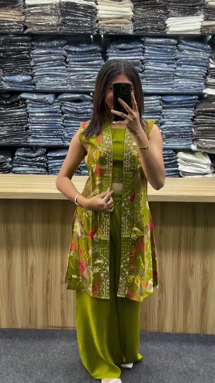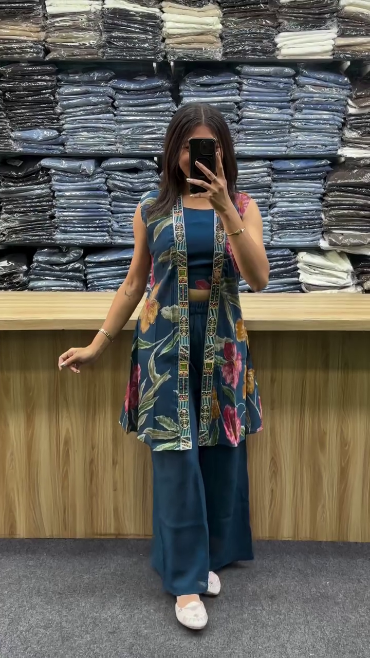This trendy co-ord set features a sleeveless inner top, wide-leg pants, and a long printed jacket with ethnic-style embroidered borders πŸ’—πŸŒΊ.