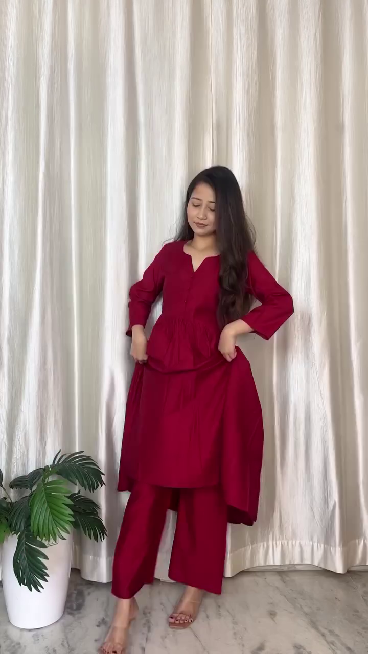 This elegant deep red casual midi dress combines simplicity with timeless feminine charm. The dress features a minimal front button panel and soft gathered waistline, creating a graceful and flattering flow that enhances the silhouette while maintaining maximum comfort.