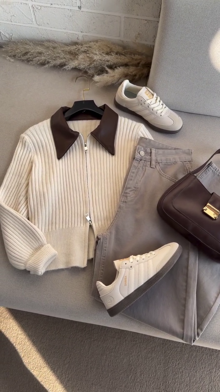 This laid-out ensemble is a cozy dream in neutral tones 🌾🧢. The cream ribbed zip-up sweater with a rich brown collar pairs effortlessly with light gray pants and white sneakers with gold accents πŸ‘Ÿβœ¨. A dark brown handbag adds elegance, while the pampas grass and brick wall backdrop evoke calm and curated charm 🌿🧱.