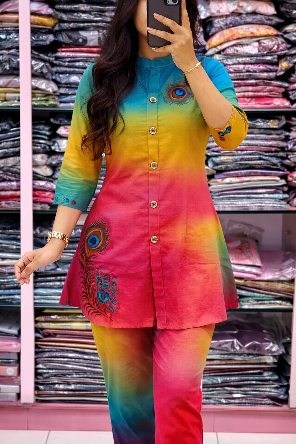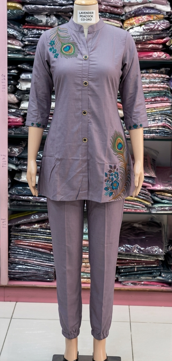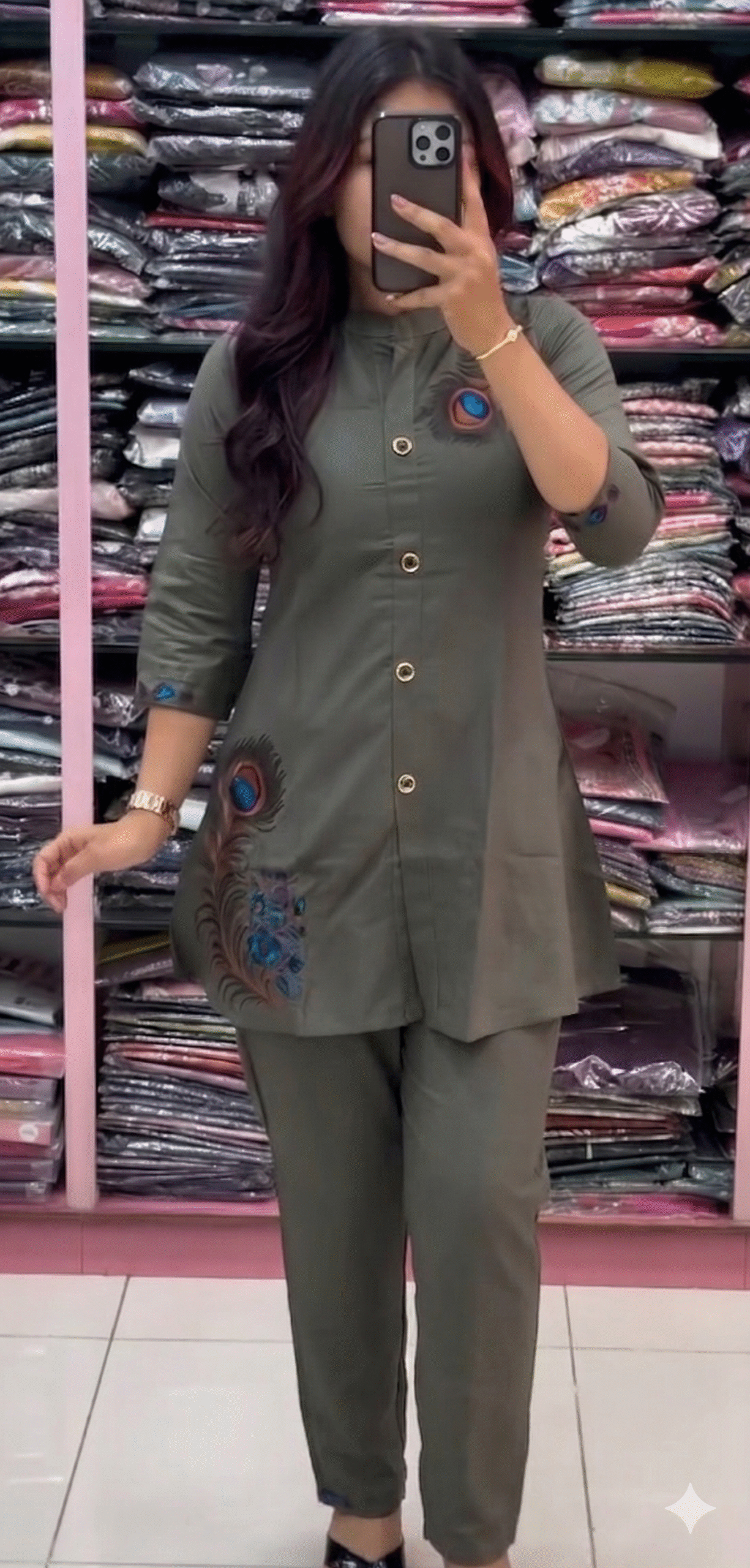 Elevate your everyday style with this elegant olive green co-ord set, designed with a perfect blend of simplicity and charm. The kurti features a front button-down design with a smart round neckline, giving it a neat and modern look. The highlight of this outfit is the beautiful peacock feather print, adding a touch of traditional artistry with a trendy twist.