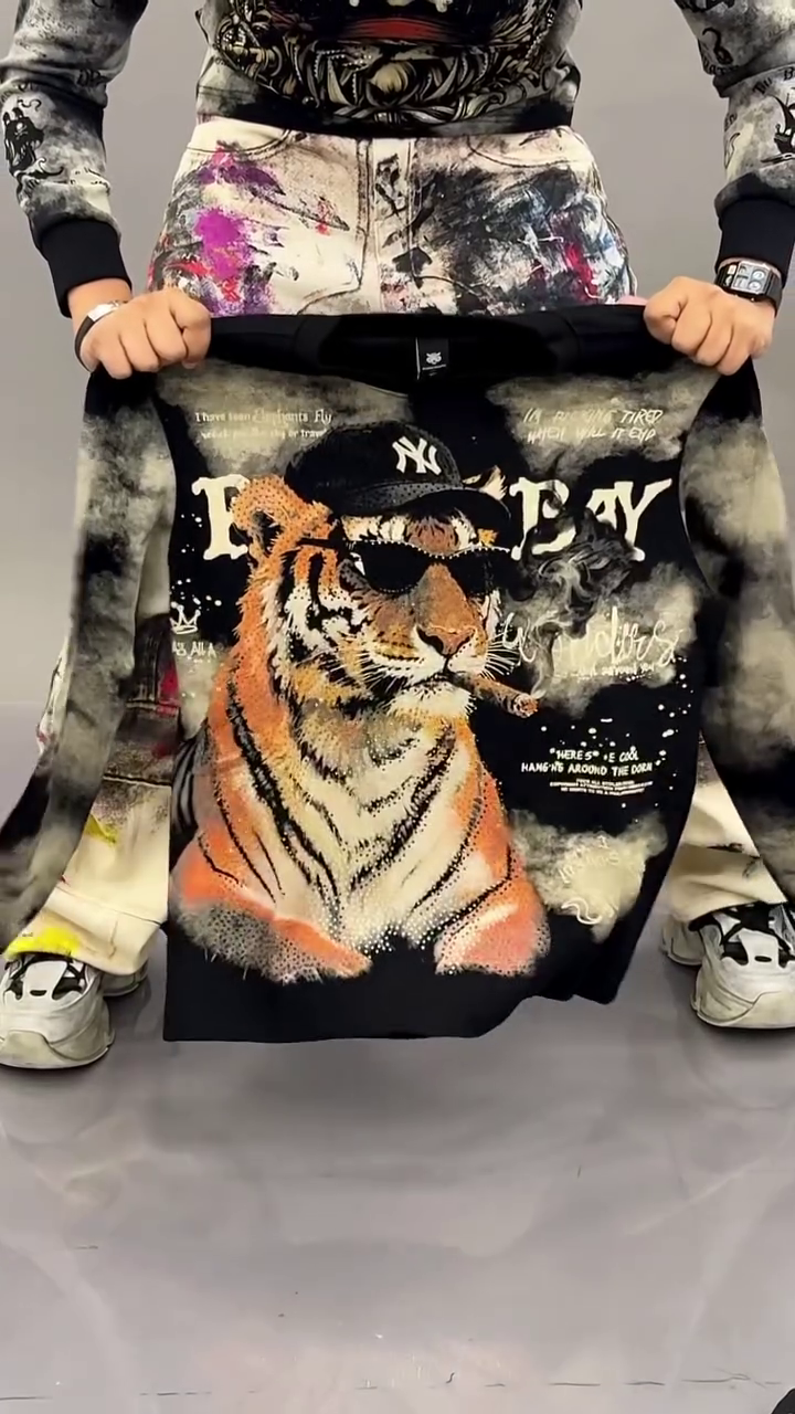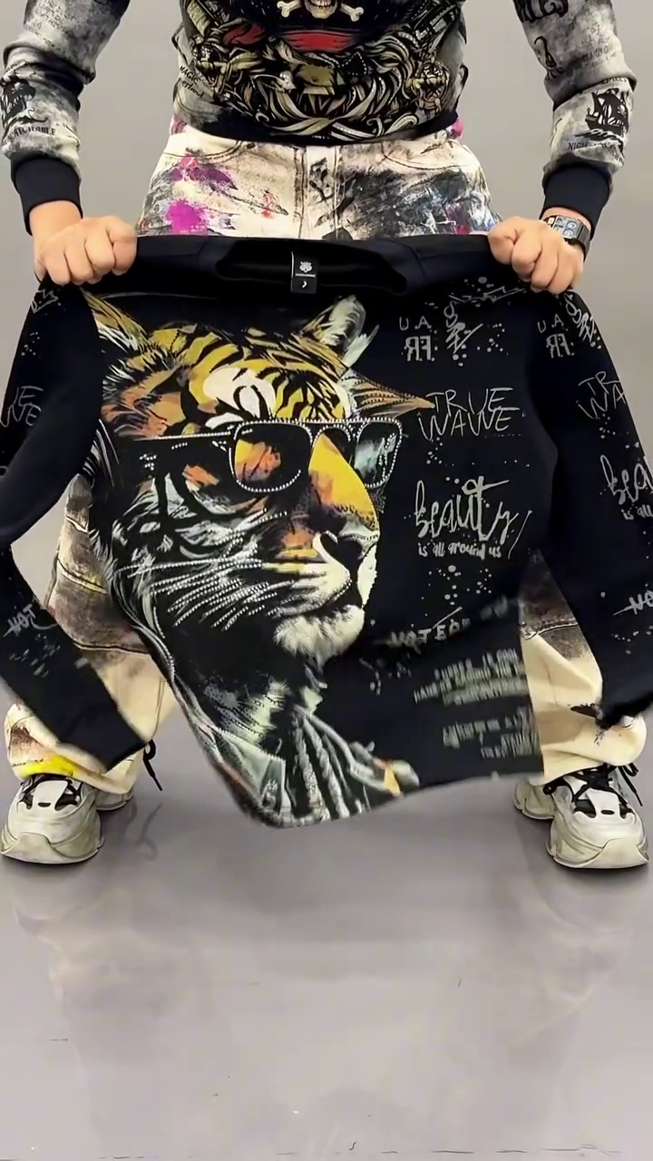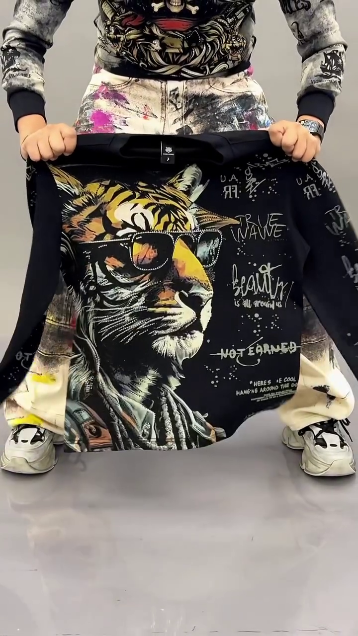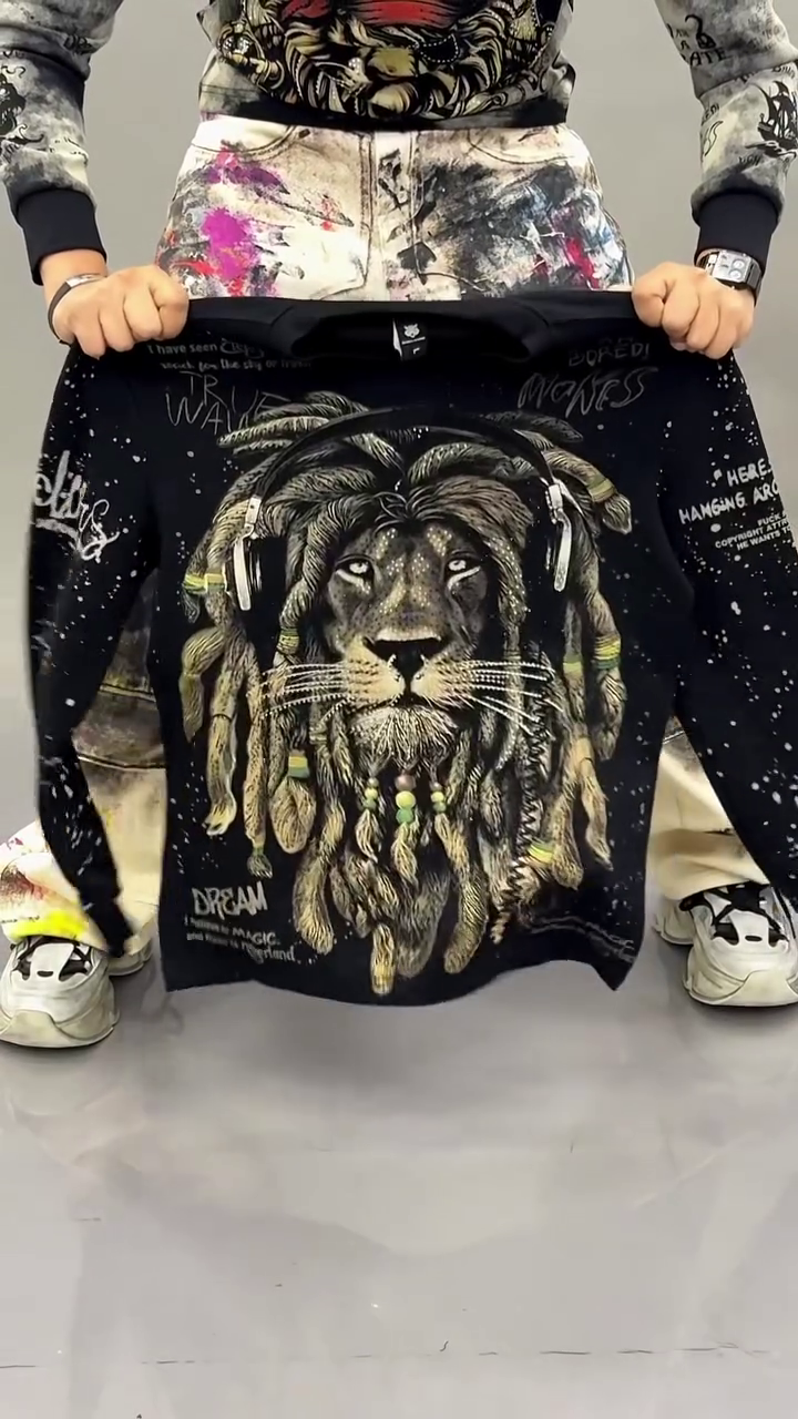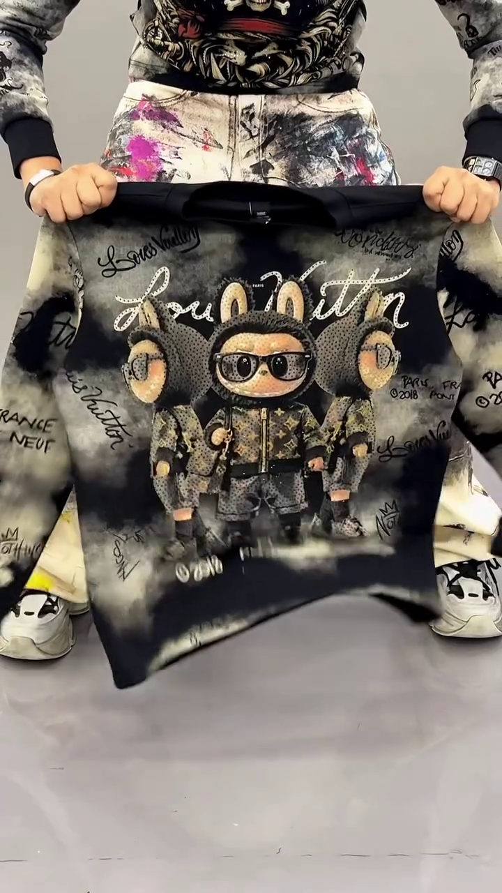 This bold black oversized sweatshirt π€ features a statement front graphic illustration π of three stylized cartoon characters in streetwear fashion π. The artistic washed smoke-effect background π«οΈ adds a trendy edgy vibe perfect for modern fashion lovers π₯.