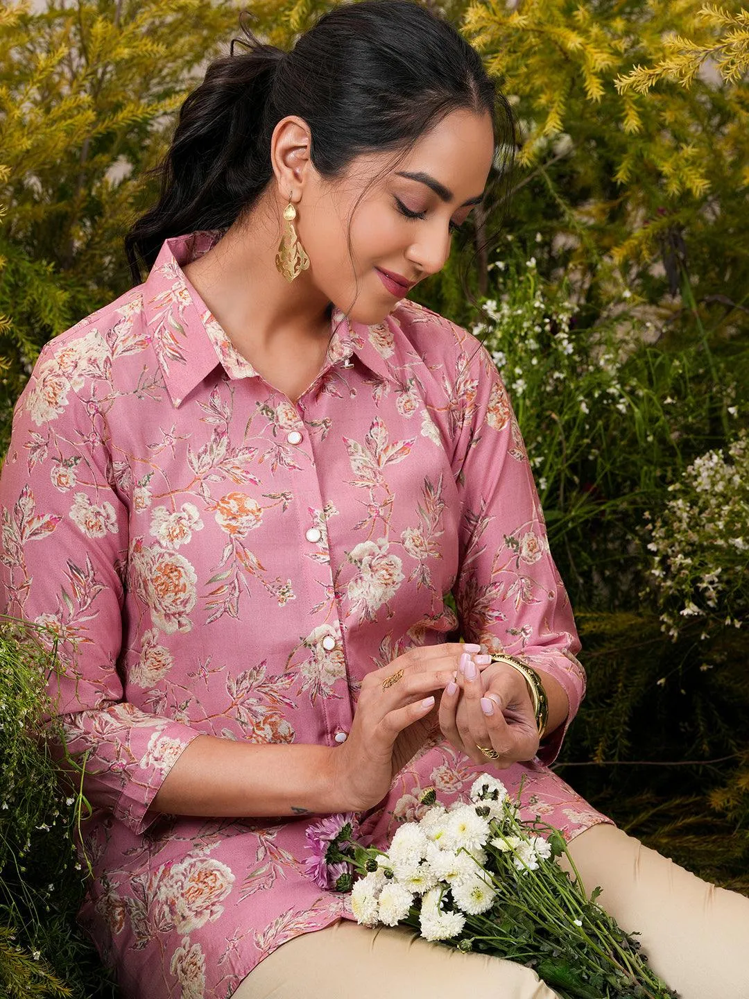Pink Printed Silk Blend A-Line Kurti – A Fusion of Elegance and Comfort