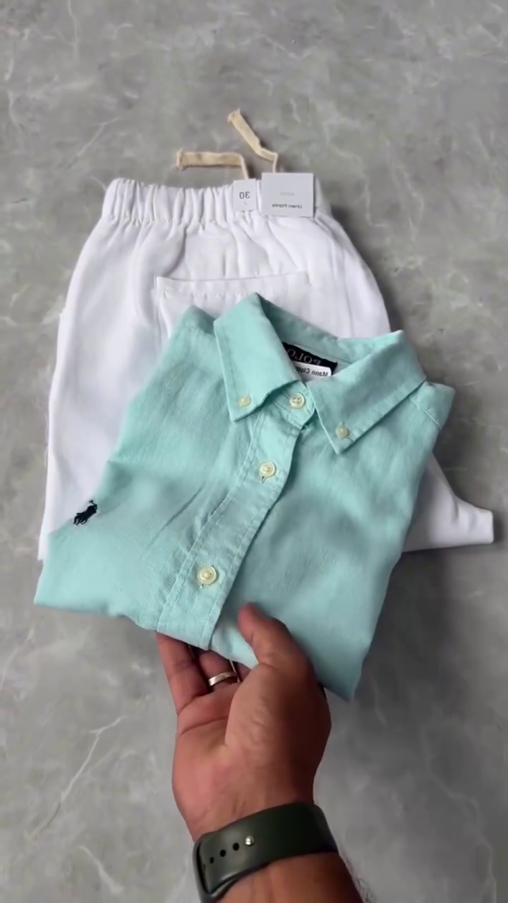 Refresh your wardrobe with this fresh summer inspired outfit combo featuring a mint green casual shirt paired with comfortable white drawstring trousers. This combination delivers a clean minimal look perfect for warm weather styling .
