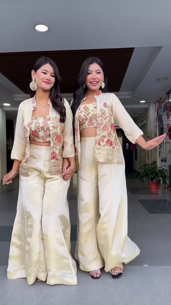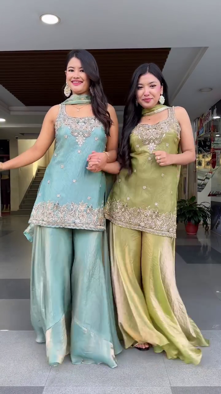 Paired with wide-flared shararas made from a flowy, glossy fabric, the outfit creates a dreamy silhouette with every step, swirl, and twirl ππ. The sharara falls elegantly, adding movement and charm while staying incredibly lightweight and breathable.
