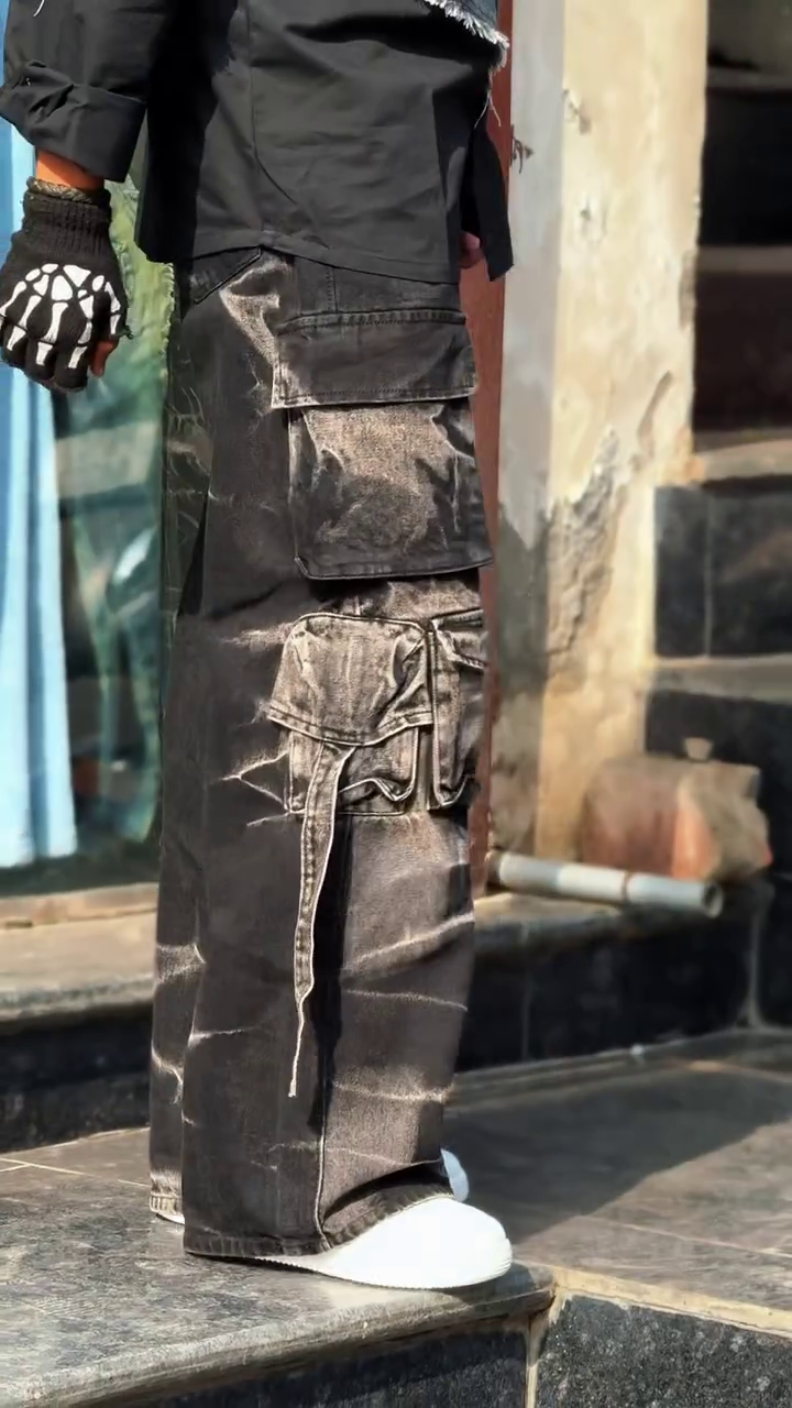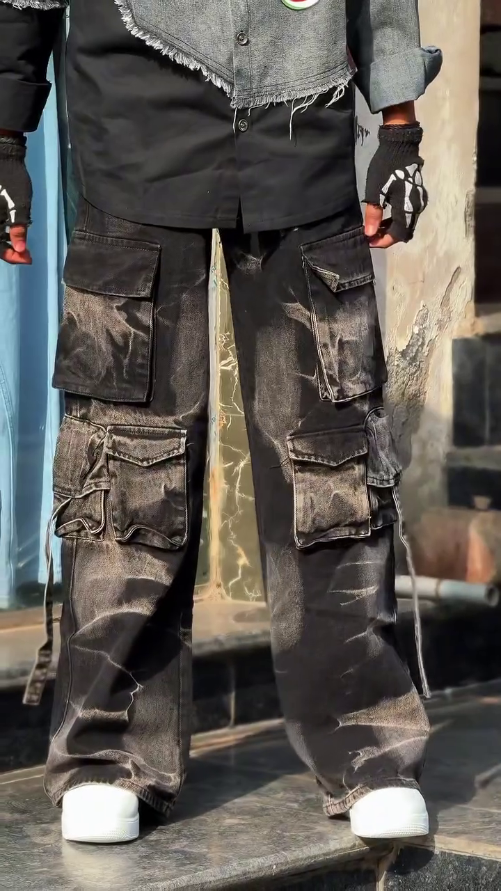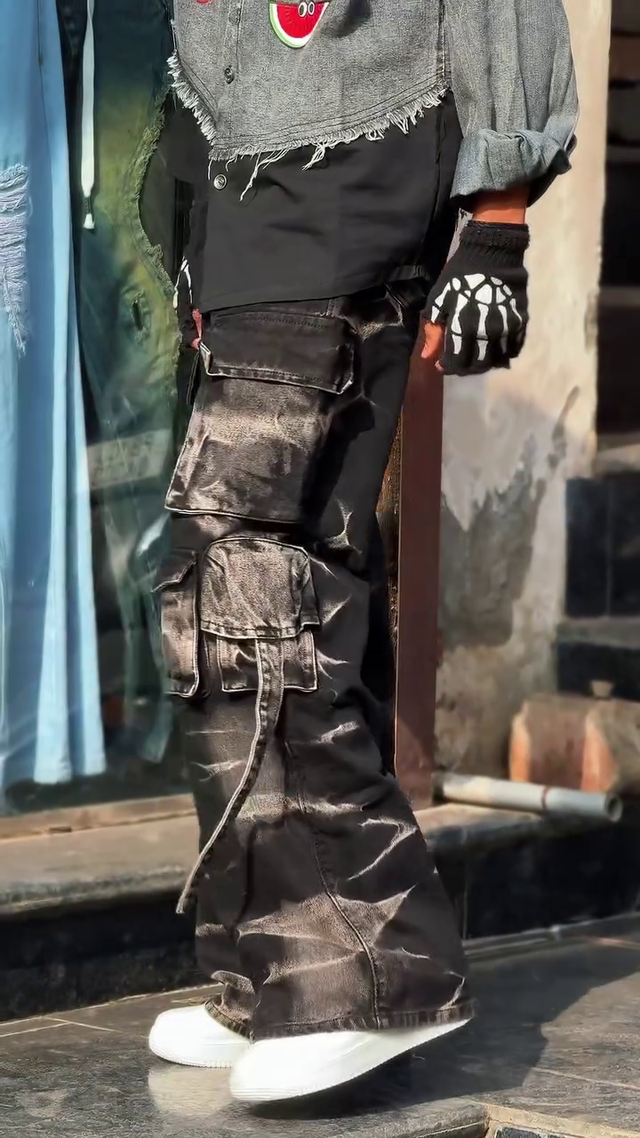 Command the streets in these black cargo pants with a distressed wash and oversized flap pockets 🏙️👖. The drawstring details and rugged texture scream functionality with flair, while the layered top and skeleton gloves add a rebellious twist 💀🧥.