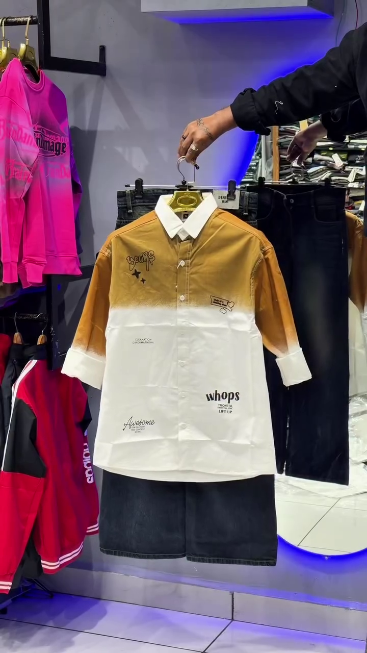 This modern two-piece western casual outfit set combines a stylish graphic printed shirt with classic denim jeans for a relaxed contemporary look.