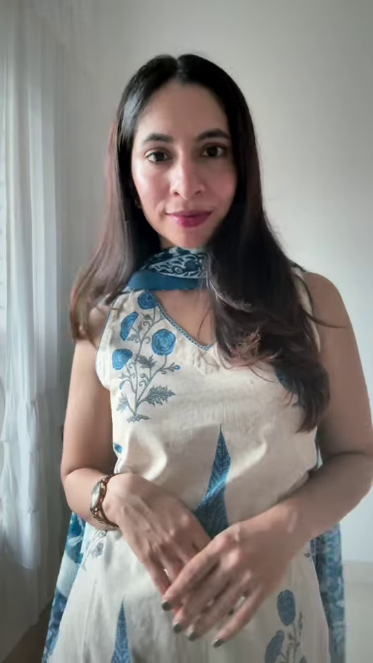 Step into elegance with this sleeveless ethnic suit set, designed in soft cotton fabric with fresh blue floral and leaf block prints. The set includes a straight-cut kurta, matching printed pants, and a coordinated dupatta, creating a light and graceful ensemble perfect for warm weather.