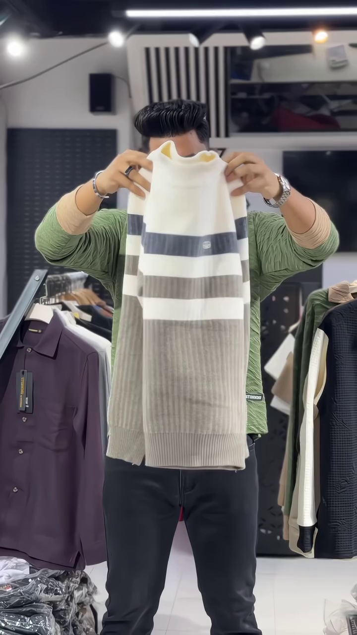 This color-blocked sweater is a visual symphony of cream, white, and charcoal gray 🎼🧶. With ribbed textures, vertical black stripes, and a structured silhouette, it’s a piece that balances softness with statement 🧵🖤.