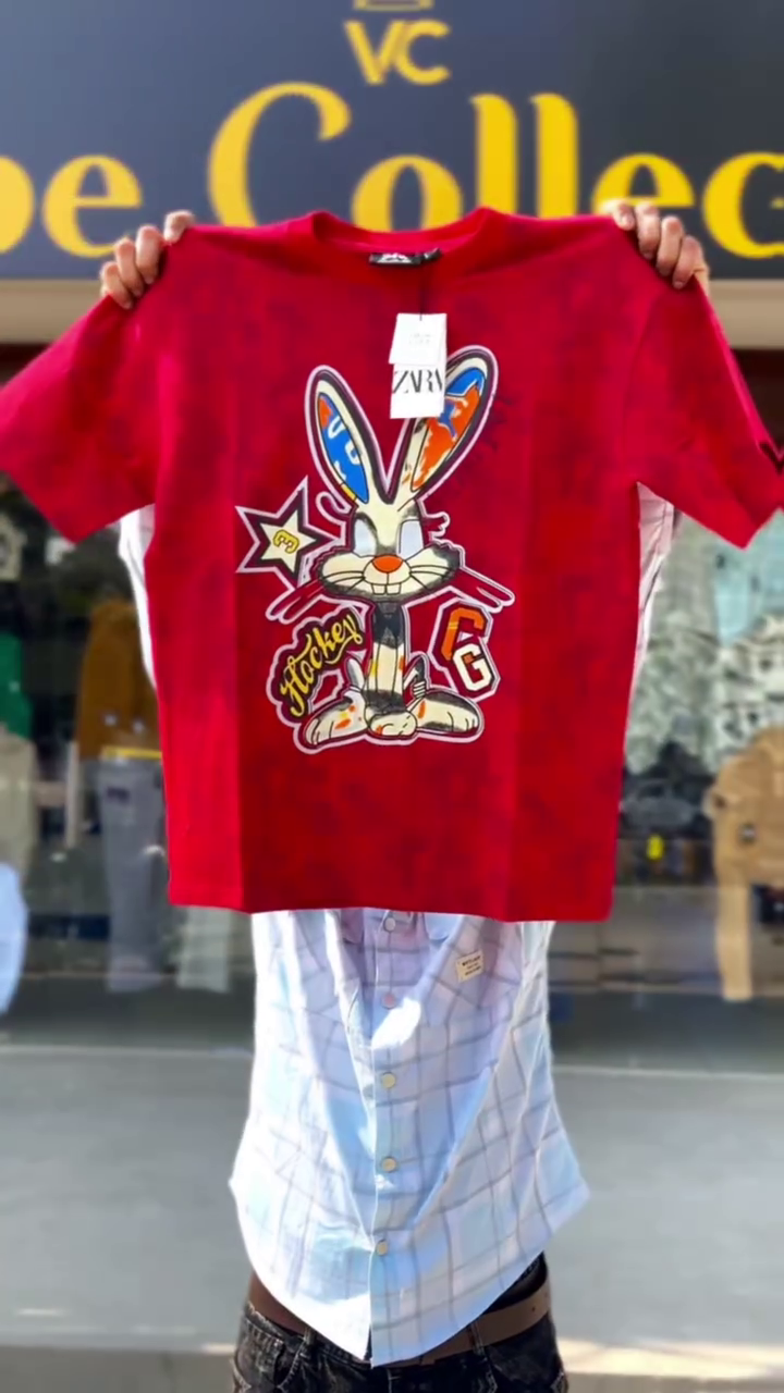 ❀️πŸ”₯ This eye-catching bright red oversized T-shirt features a large cartoon bunny graphic print at the center 🐰✨ with multicolor ear detailing 🎨 (blue, orange & white accents) that creates a bold street-style statement. The design also includes sporty letter patches and graphic elements πŸ…Άβ­ giving it a trendy urban vibe 😎.